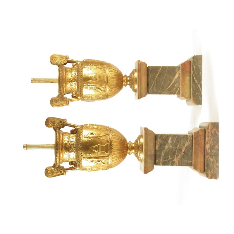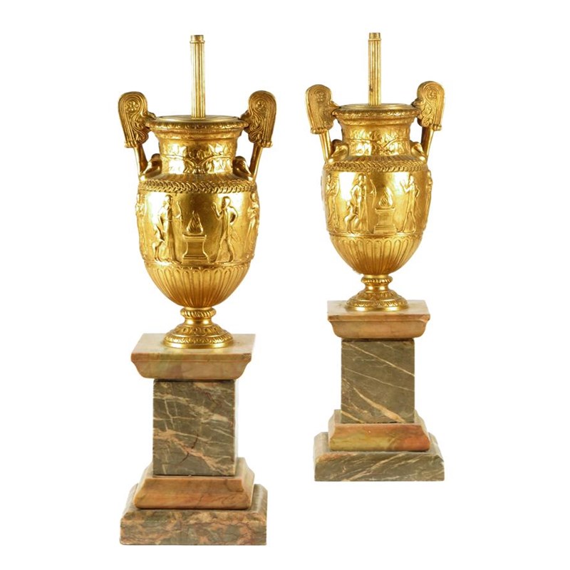A pair of gilt brass classical urn table lamps, the bodies decorated with figures on marble plinths, 44.4cm high, 14cm wide. (2)