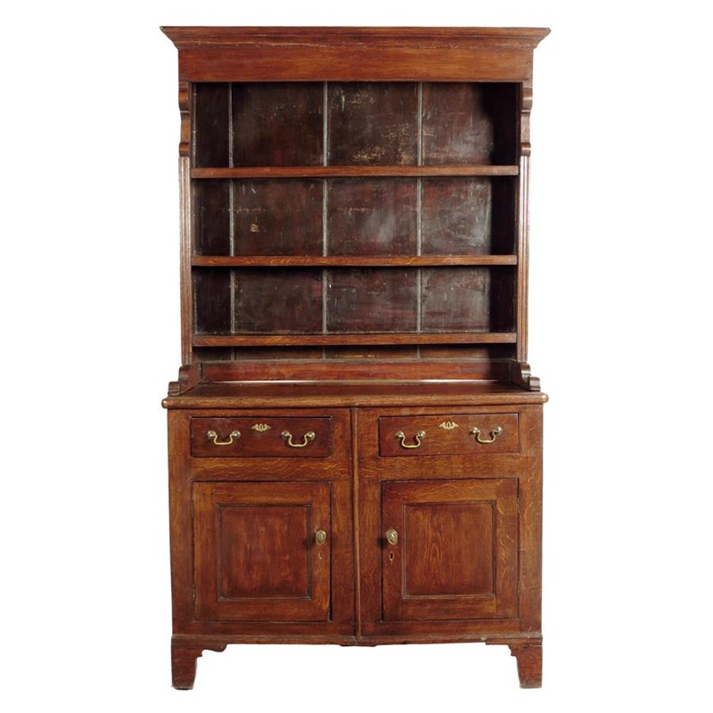 An oak dresser, the boarded plate rack with three shelves above a pair of frieze drawers and panelled drawers enclosing a shelf, George III but reduced in width, 204.6cm high, 122cm wide, 47.5cm deep.
