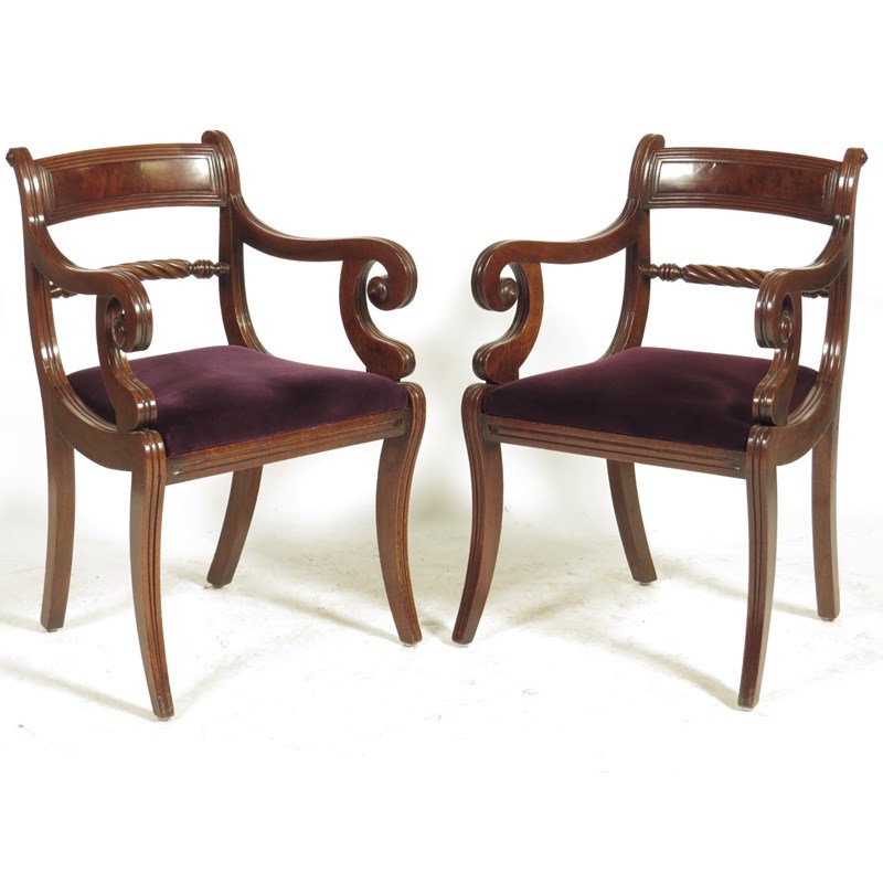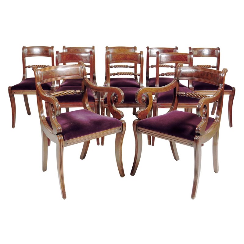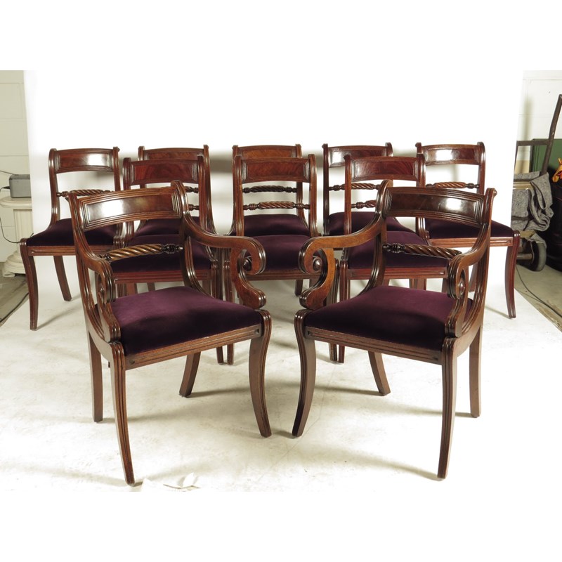 A set of ten mahogany dining chairs, each with a tablet back above a rope twist horizontal splat above a drop-in seat on sabre legs, comprising: a pair of open armchairs and eight side chairs, six early 19th century and four modern. (10)