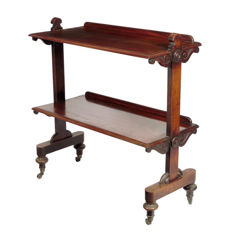A William IV mahogany two tier dumb waiter, with scroll carved decoration non turned feet and brass castors, 96.3cm high, 91.3cm wide, 39.3cm deep.