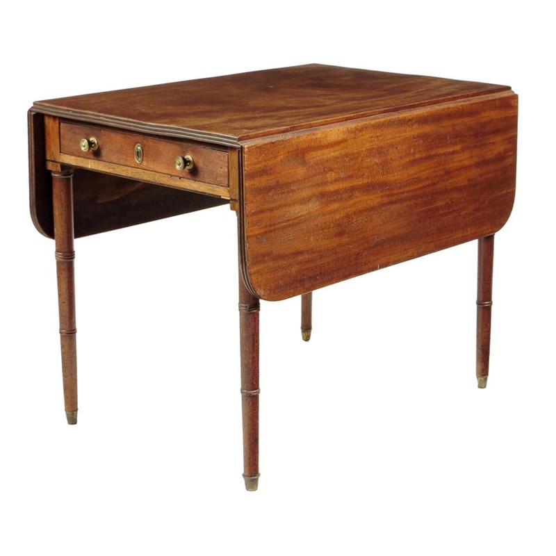 A George IV mahogany Pembroke table, inlaid with ebonized stringing, the drop-leaf top with a reeded edge above a frieze drawer, the reverse with a false front, 68.8cm high, 59.7cm wide wide, 85.8cm deep.