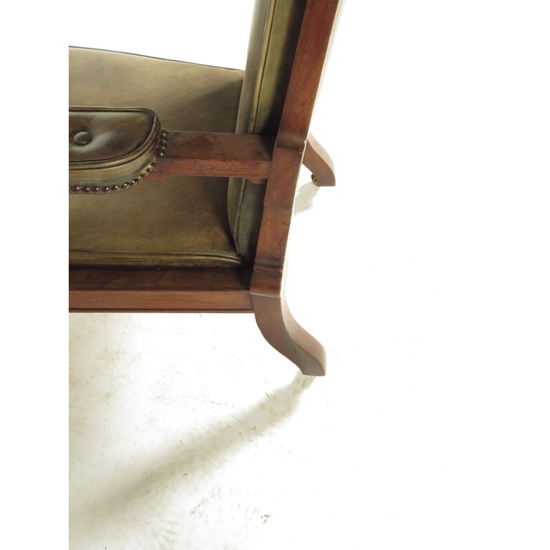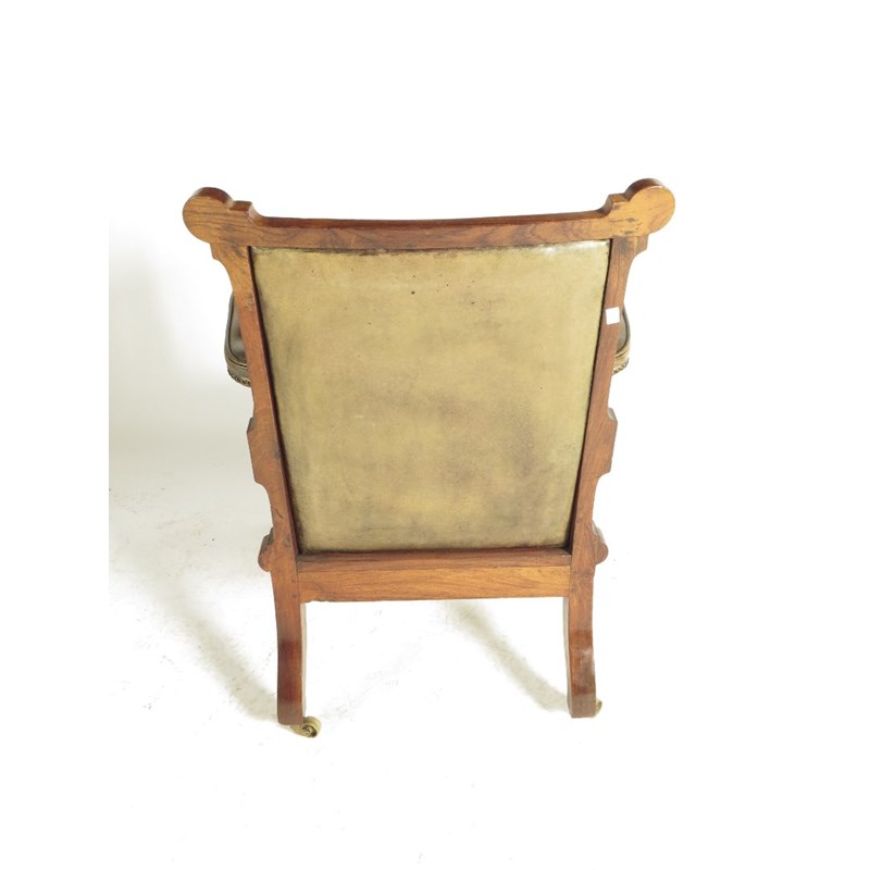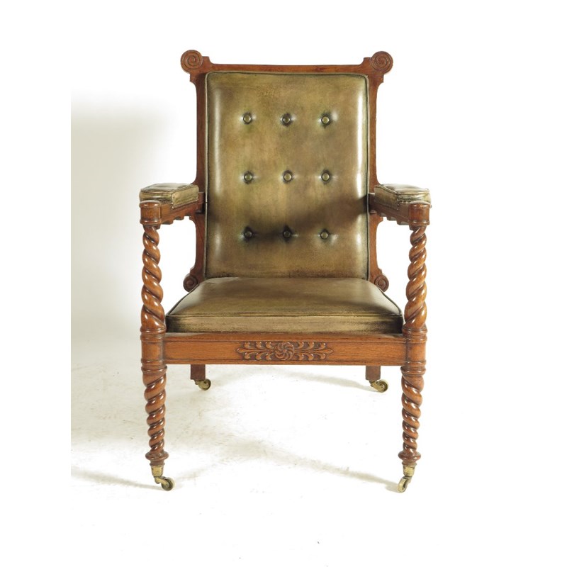 λ A 19th century Colonial rosewood library open armchair, with a green leather padded back, seat and armrests, on spiral twist supports and brass castors.