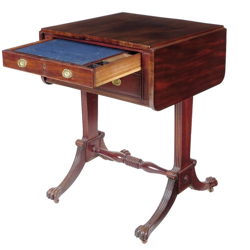 A George IV mahogany work table, the drop-leaf top above two cedarwood lined frieze drawers, the top drawer fitted with a hinged writing slope and compartments for pens and inkwells, on reeded supports and paw feet, 76.9cm high, 55.3 cm wide (closed), 51.2cm deep.