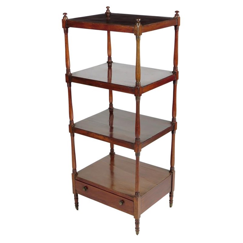 A George IV mahogany whatnot, with four tiers, the base fitted with a drawer, on brass castors, 131.5cm high, 52.8cm wide, 43cm deep.