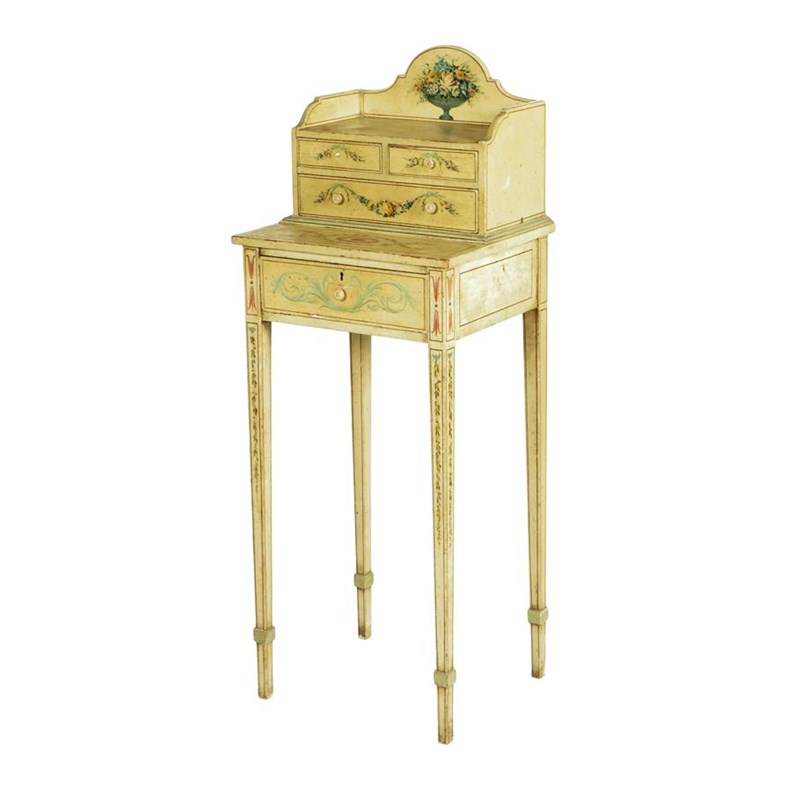 λ A late George III painted pine cheveret, decorated with an urn of flowers, swags of flowers and scrolling leaves, the galleried top above three drawers with ivory handles, with square tapering legs and applied ankles, 100.8cm high, 38cm wide, 32cm deep.