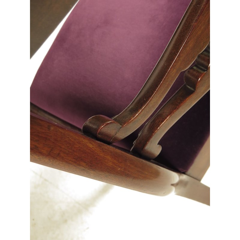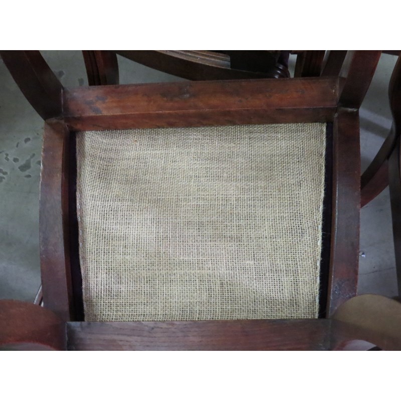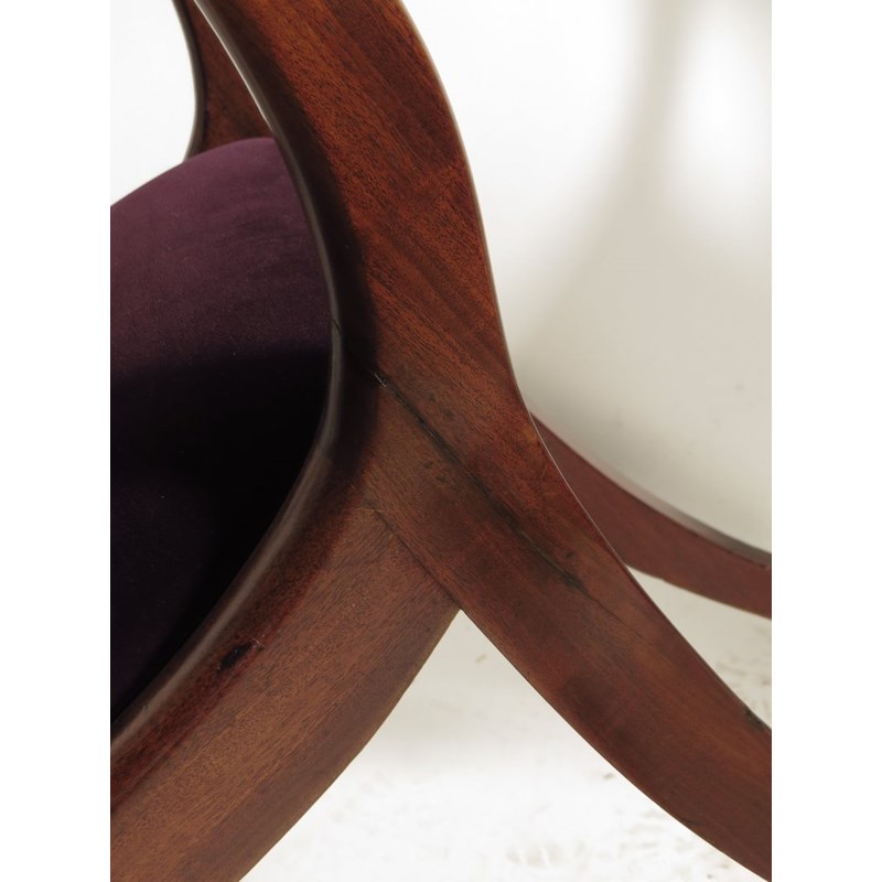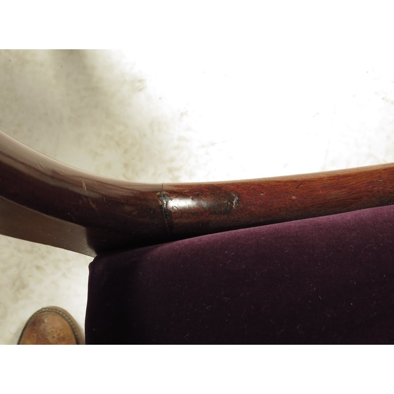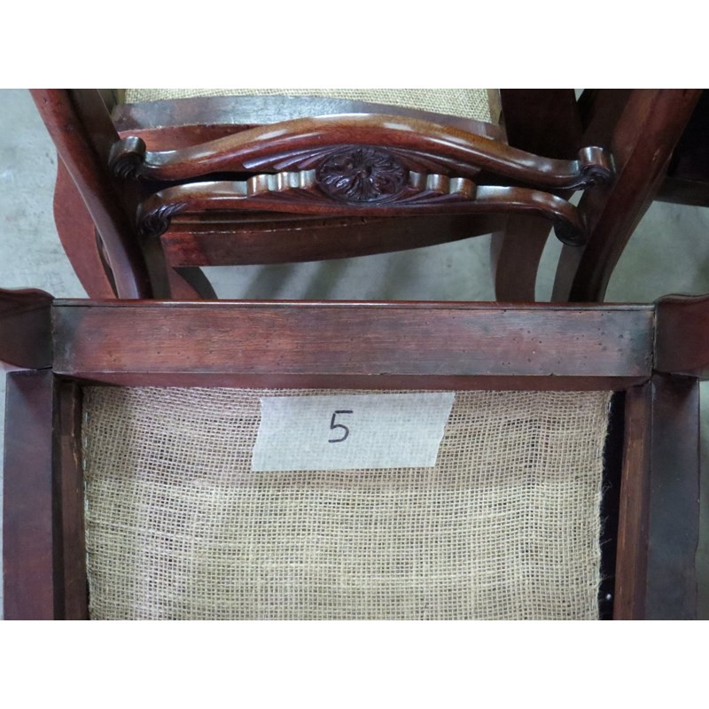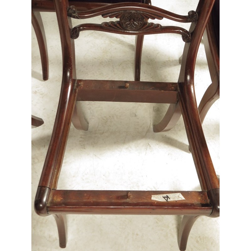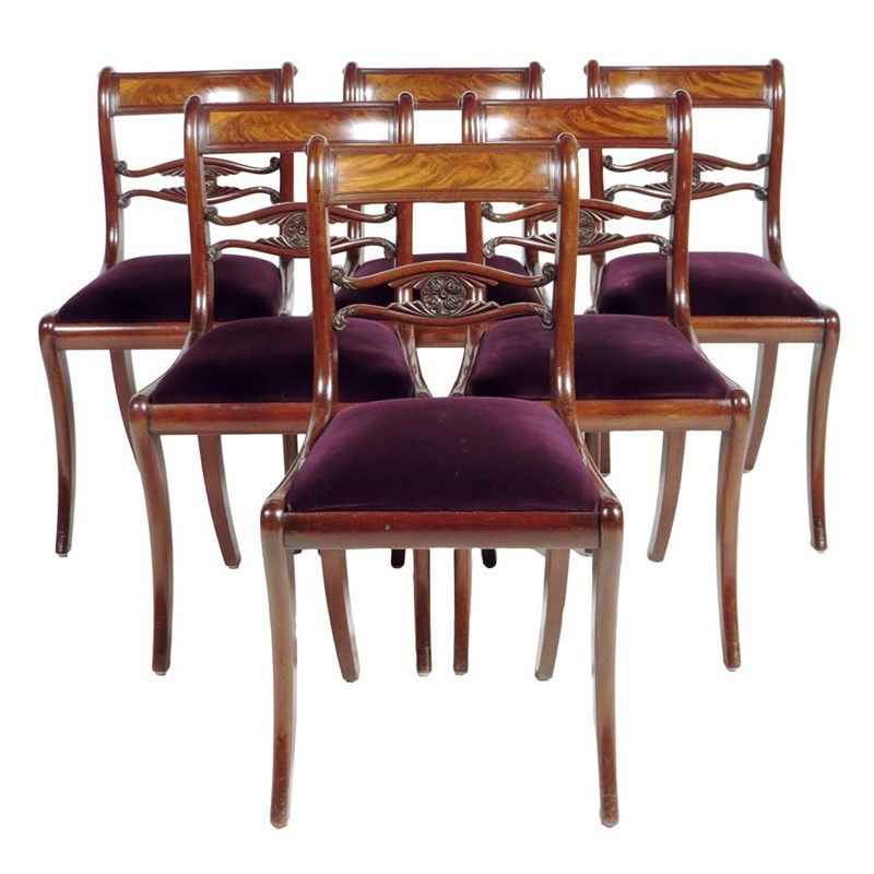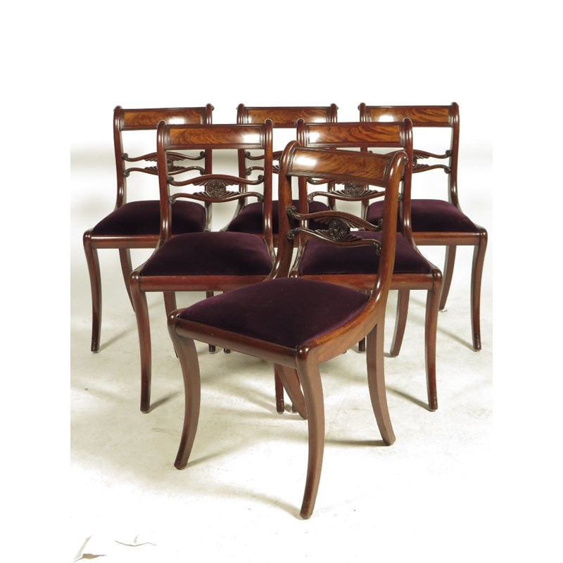 A set of six late Regency mahogany dining chairs, each with a curved tablet back and a horizontal splat above a drop-in seat above sabre legs. (6)