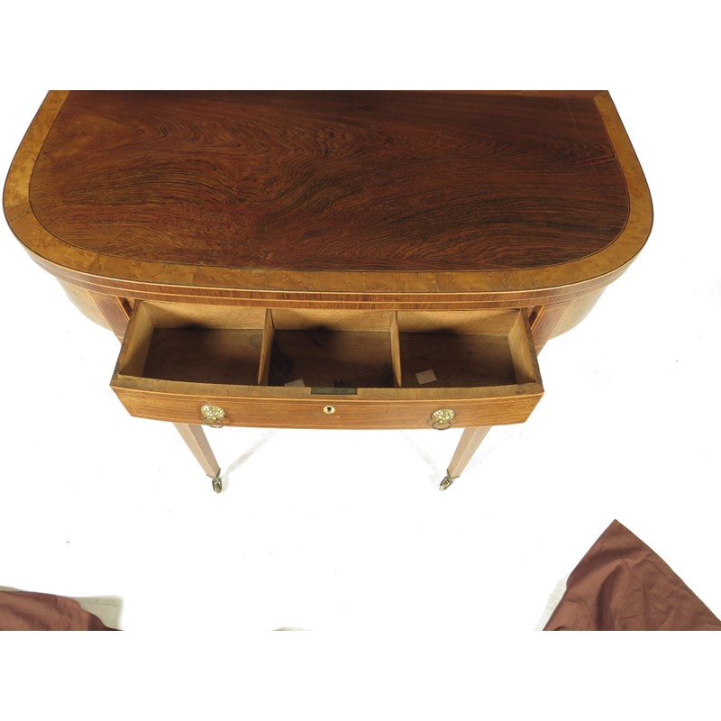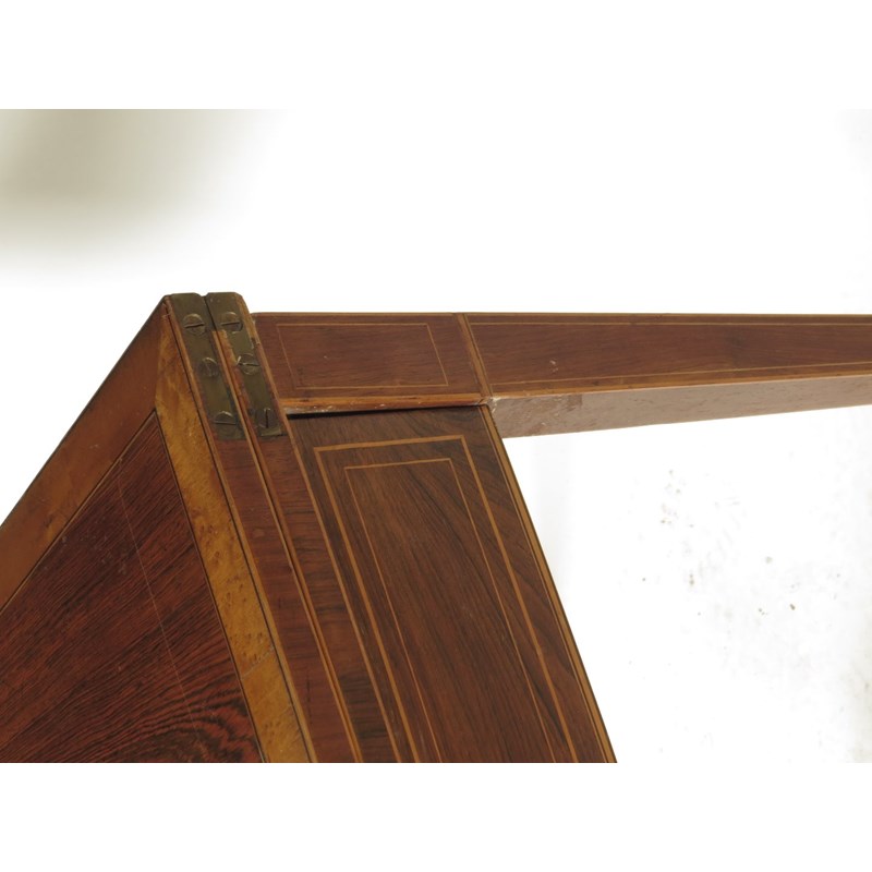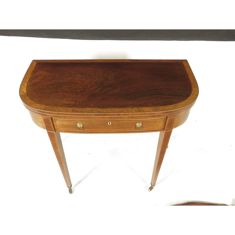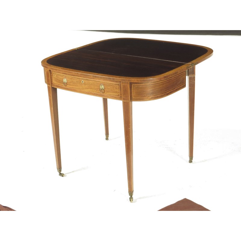 λ A Regency rosewood tea table, with boxwood stringing, the fold-over top banded with bird's eye maple above a frieze drawer fitted with an ivory escutcheon and with divisions, on square tapering legs and brass castors, 75.5cm high, 88.7cm wide, 45.5cm deep.