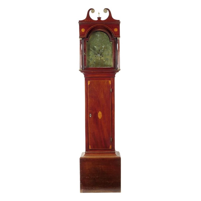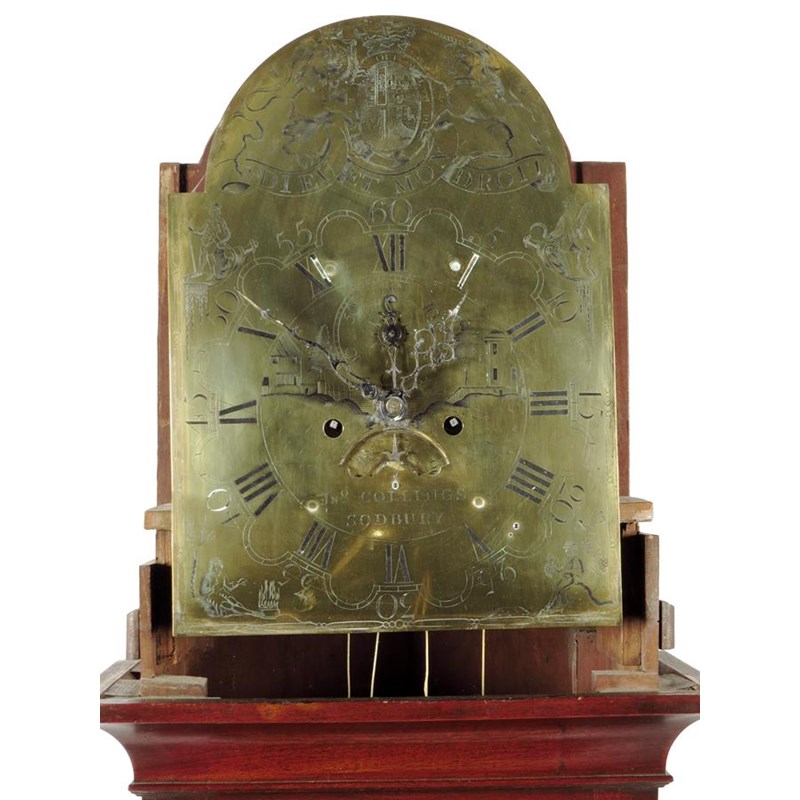 A mahogany longcase clock, the brass dial signed 'Jno. Collings, Sodbury', the centre with subsidiary seconds and calendar sector amongst an engraved village scene, four seasons spandrels, arcaded minutes, the arch engraved with a lion and unicorn and Dieu et mon droit, the eight day four pillar movement in a case with swan neck pediment and shell pattern inlays, 85in (206cm) high.