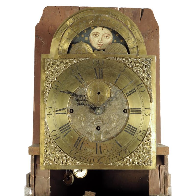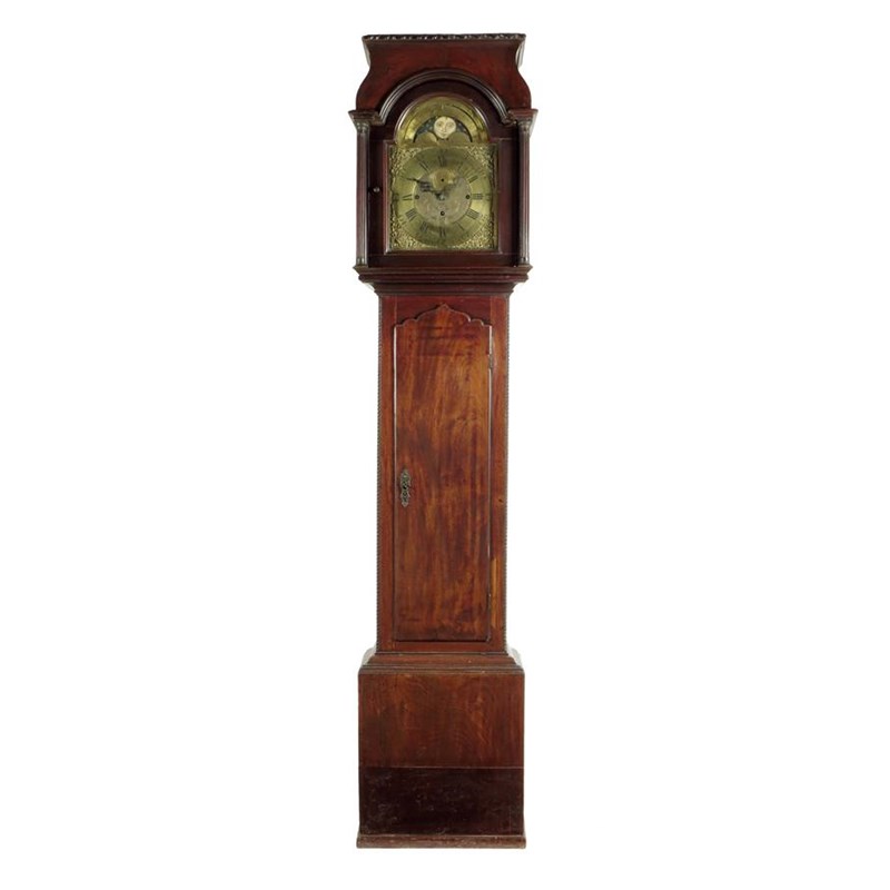 A mahogany longcase clock, the eight day movement striking on nine bells with an arched brass dial with a moon phase and subsidiary seconds dial inscribed 'Matt W Jeweler BRISTOL', with Roman and Arabic numerals, the top inscribed 'HIGHWATER AT BRISTOL KEY', with a gadroon decorated case and a later plinth, 199.8cm high (without the later plinth), 49cm wide.