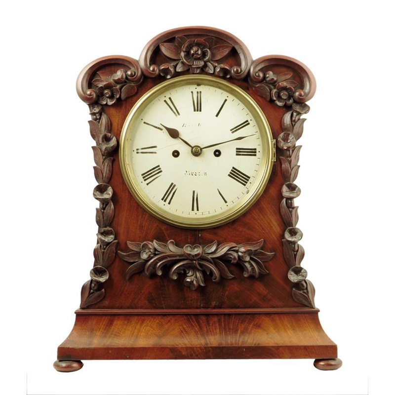 A Victorian mahogany mantel clock, the white painted dial with faded signature, the two-train fusee movement in a case with triple scrolled top, the front applied with carved floral swags, 19in (49cm) high.