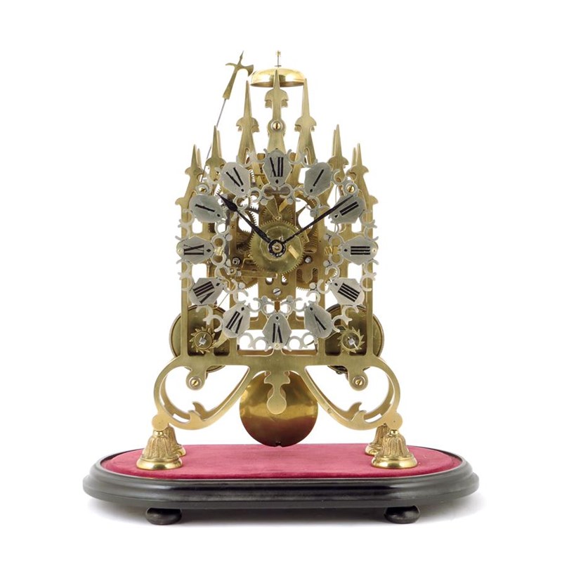 A striking skeleton clock, the two-train fusee movement with anchor escapement and striking on a bell above, in architectural plates with scrolled bases, with a pierced silvered chapter ring, on ebonized stand, 16in (41cm) high with glazed dome.
