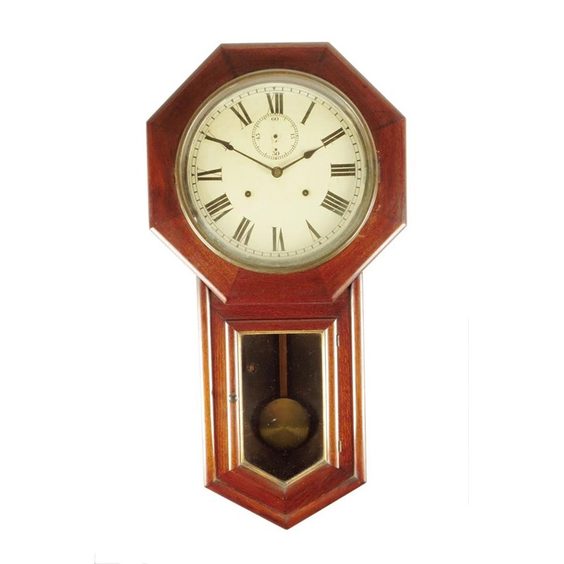 A mahogany drop dial wall clock, with an eight day movement, the painted dial with Roman numerals and a subsidiary seconds dial, the octagonal top above a glazed door, 81.8cm high, 42.8cm wide.