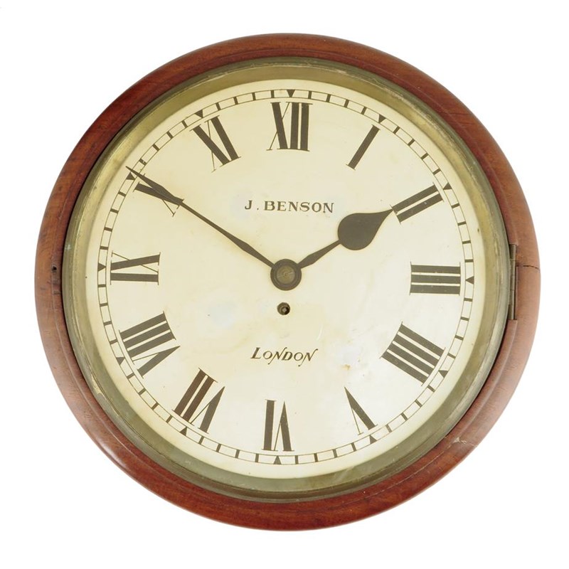 A mahogany dial wall clock, the single fusee movement stamped '4152' to the backplate, within a moulded case with a brass bezel, the painted dial with Roman numerals and inscribed 'J. BENSON LONDON', 44.5cm diameter.