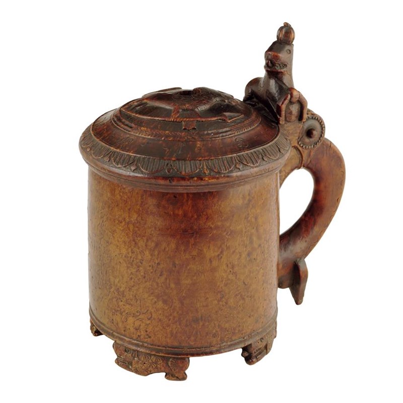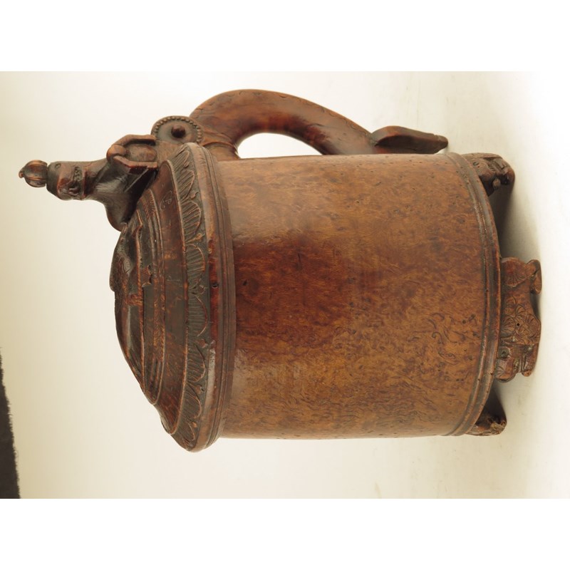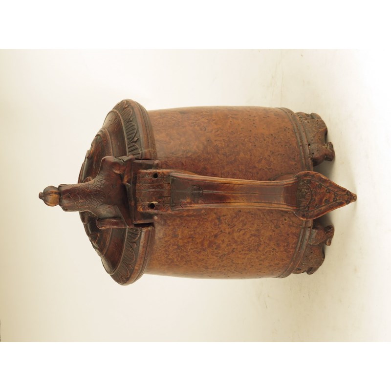An early 19th century Norwegian burr birch peg tankard, carved with lions, the hinged lid with initials and dated '1815', 25.2cm high, 23cm wide.
