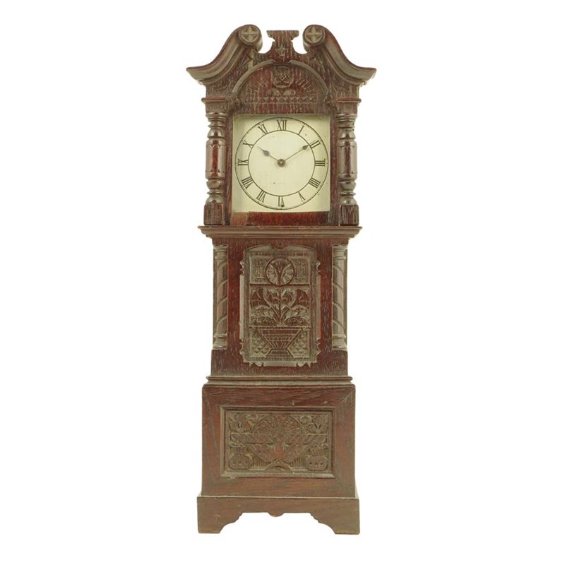 An oak mantel timepiece, of miniature longcase form, the square silvered dial, with a drum movement with lever platform in a florally carved case with swan neck pediment, 37cm high.