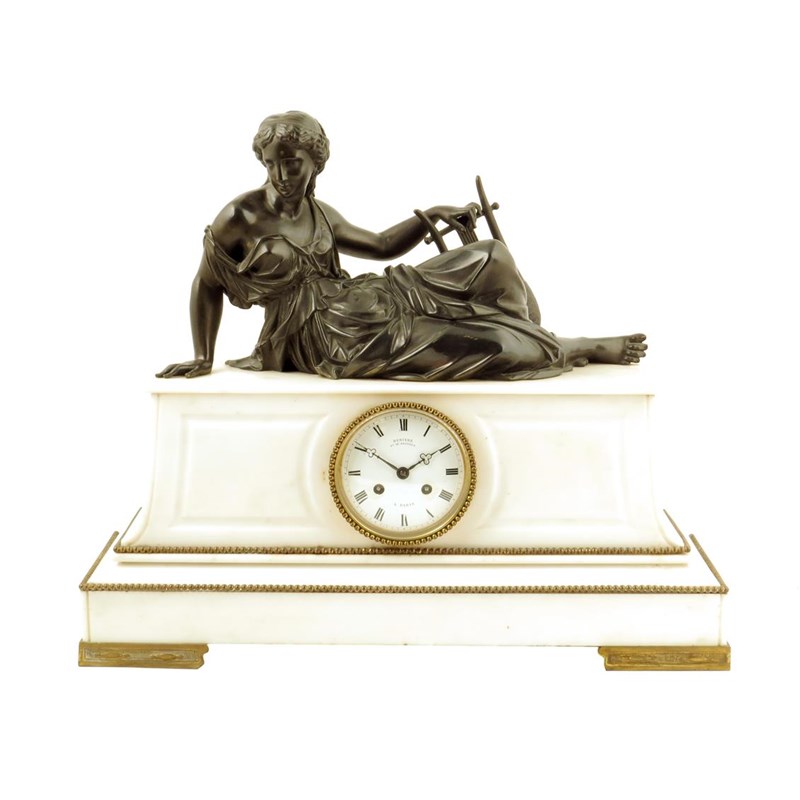A large French white marble and bronze mantel clock, the white enamel dial and striking drum movement signed 'Deniere, Ft. de Bronzes, a Paris, no. 1763', numbered pendulum, in a plinth case surmounted by a reclining lady with a lyre, 50cm wide.