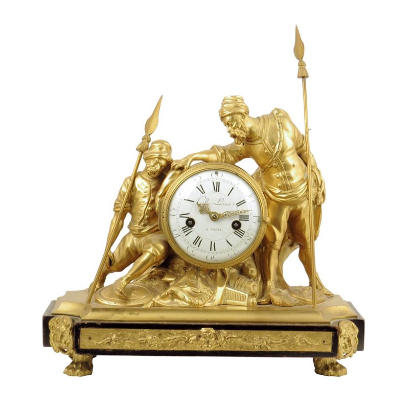 A late Louis XVI ormolu mantel clock, the case attributed to Nicolas Bonnet, the convex white enamel dial signed 'Gille L'aine a Paris', Roman hours and outer Arabic minute ring, pierced gilt hands, the silk suspension movement in a drum case flanked by two Turkish warriors with spears resting above military trophies, the shaped ebonized base inset with ormolu plaques and corner lion masks, on claw feet, 46cm high.