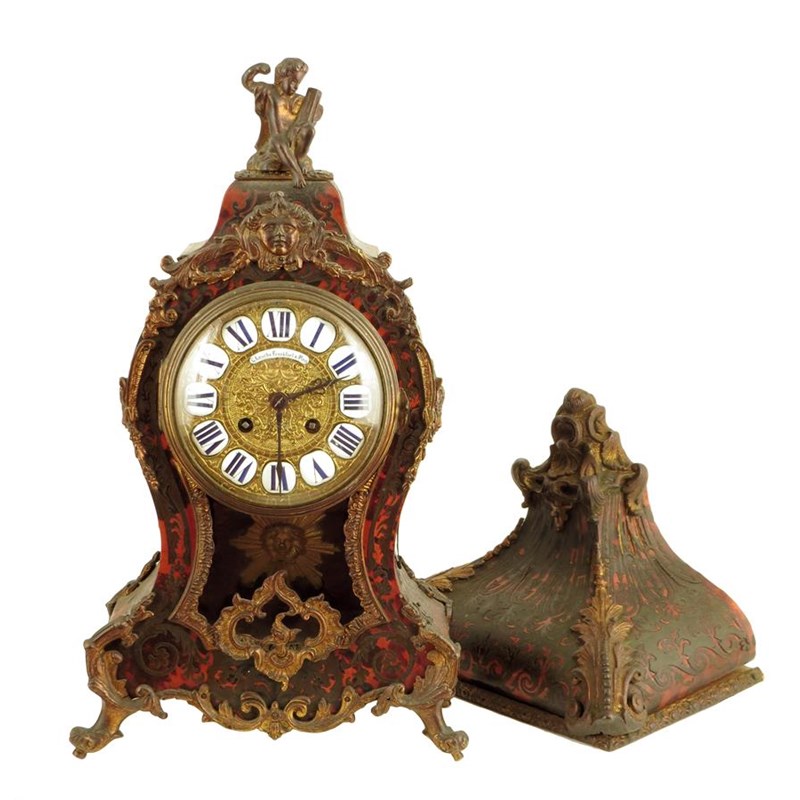 λ A 19th century tortoiseshell and brass boulle marquetry bracket clock and bracket, the circular movement striking on a bell and numbered '1576', the wasted case with gilt brass mounts and with a cherub finial and a female mask, the circular gilt dial with enamel Roman numerals and retailer's mark 'E. LUCHS FRANKFURT a MEIN', with conforming bracket, the clock, 41.5cm high, 23.4cm wide, 12cm deep, the bracket, 18.5cm high, 24.2cm wide, 14cm deep. (2)