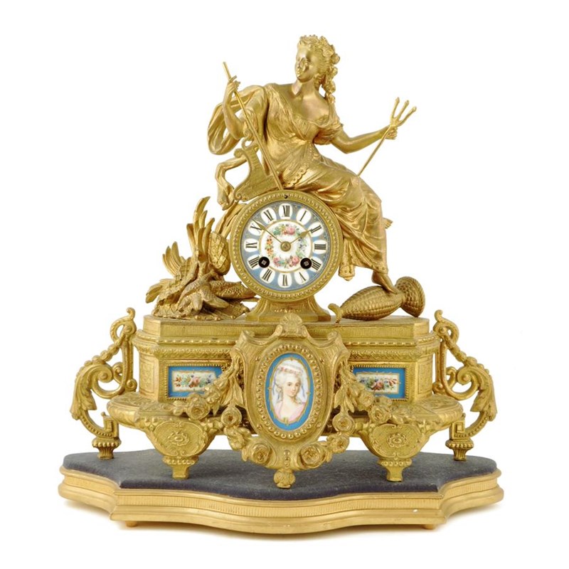 A French porcelain and gilt spelter mantel clock, the striking movement numbered '265' in a drum case surmounted by a seated Neptune type female figure holding a trident, fish and a basket at her feet, florally decorated dial, the base set with three plaques, the centre a portrait miniature, all against a blue ground, 38cm high, on a giltwood base, with ebonized stand and glazed dome.