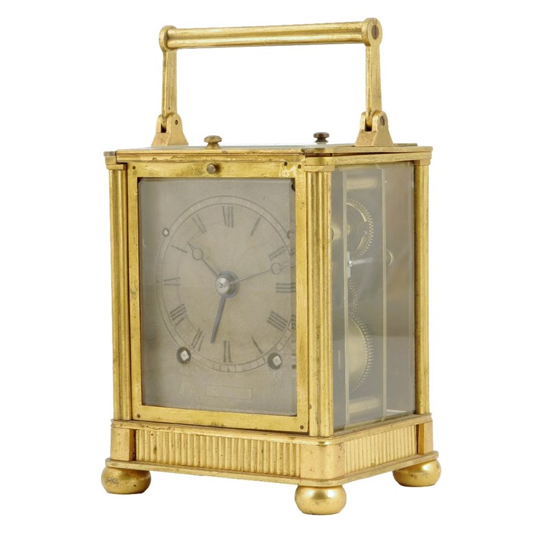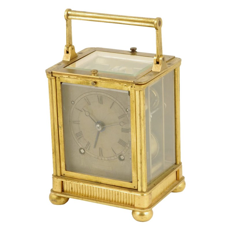 A carriage clock with alarm, the machined silvered dial with pierced Breguet type moon hands, concentric alarm hand, the three trains and alarm hand setting through the dial, movement with countwheel striking and lever platform, in a case with fluted columns, handle and bands, the glazed top sliding to allow front door and shuttered back to be lifted, on bun feet, 15cm high, with original travelling case. (2)