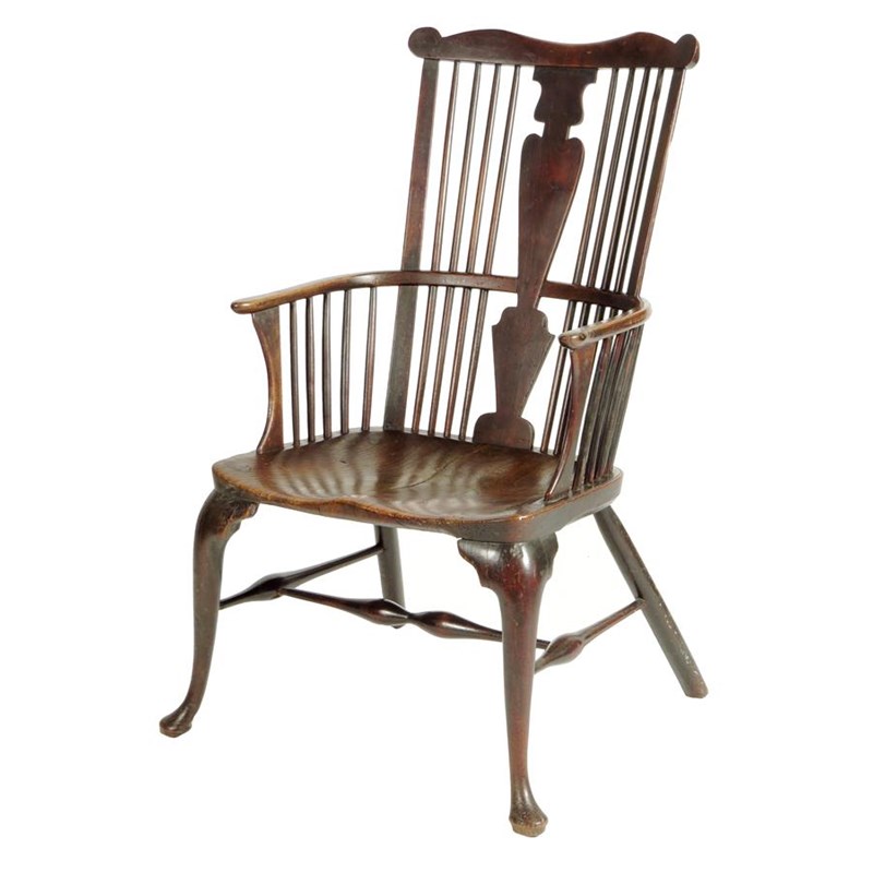 A mid 18th century cherry and elm Windsor armchair attributed to John Pitt, the comb back above a solid vase shape splat, with concave arm supports above a solid seat, on cabriole front legs and pad feet, with turned stretchers.