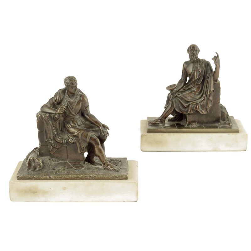 A pair of early 19th century French bronze figures, of Socrates and possibly Leon of Salamis, the philosopher seated holding a cup of hemlock, the general holding a scroll in his right hand, both on marble bases, 15.4cm high, 16.2cm wide. (2)