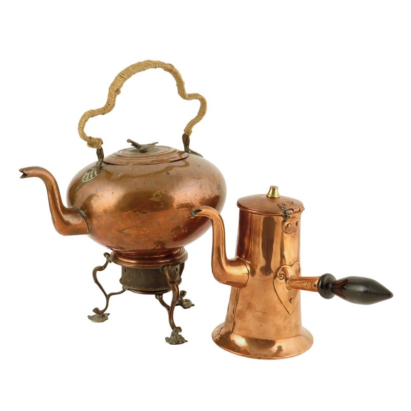 A George II copper kettle and stand, the lid with a bird handle, fitted with an iron heater, 24.2cm high, together with a copper coffee pot, with an ebonized handle. (2)