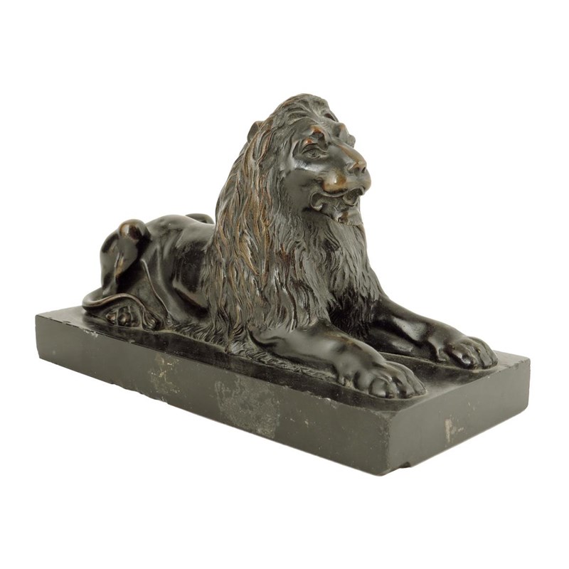 A 19th century bronze model of a recumbent lion, on a black marble base, 19cm long.