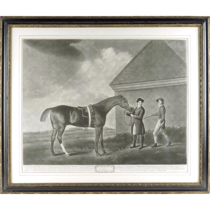 After George Stubbs (1724-1806). 'ECLIPSE the Property of DENES O'KELLY ESQR', a mezzotint by Thomas Burke, 46 x 56.5cm in a glazed, gilt and ebonized carved Hogarth type frame, the verso with a Parker Gallery Label.