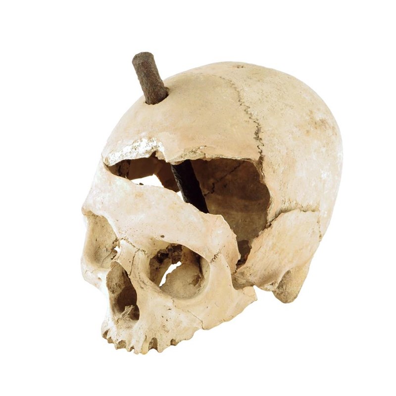 An early female skull, with a contemporary wound to her cranium and with an iron stake discovered with the skull, together with a contemporary newspaper cutting, map and typed report on card, 14.3cm high, 12cm wide.