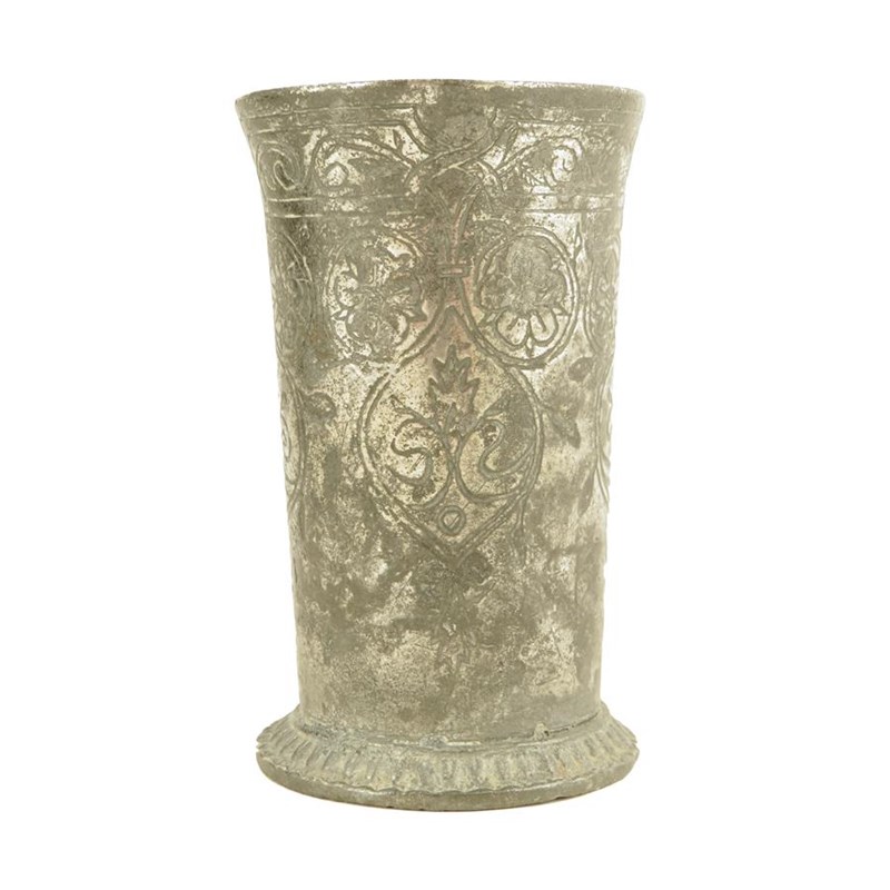 A 17th century pewter wrigglework beaker, decorated with scrolling flowers and foliage, the base with a gadrooned rim, 11.2cm high.