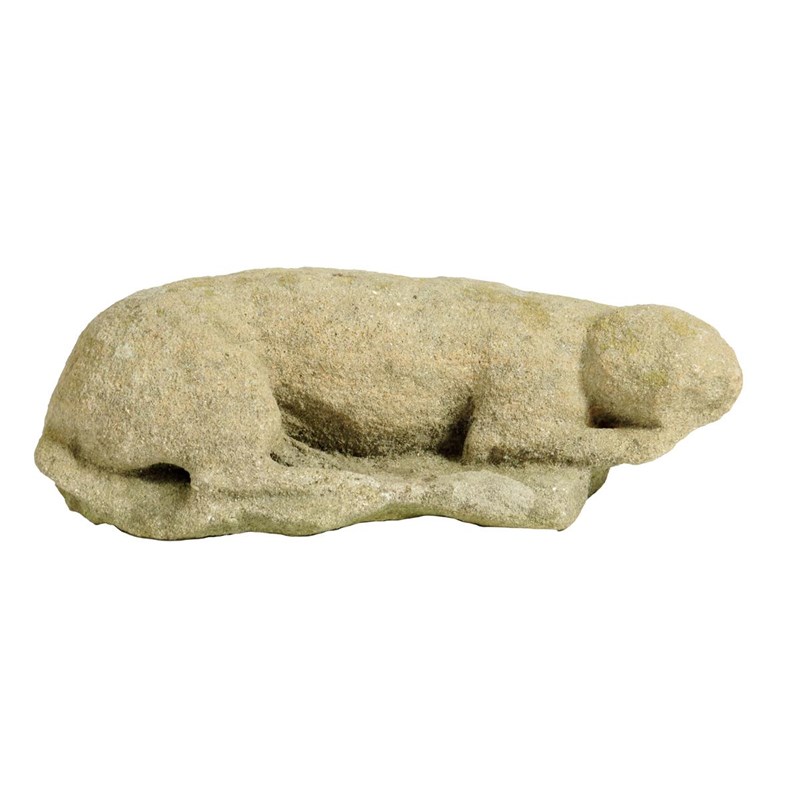 A carved stone model of a recumbent dog, possibly 14th / 15th century, from a gravestone, 16cm high, 52cm long.