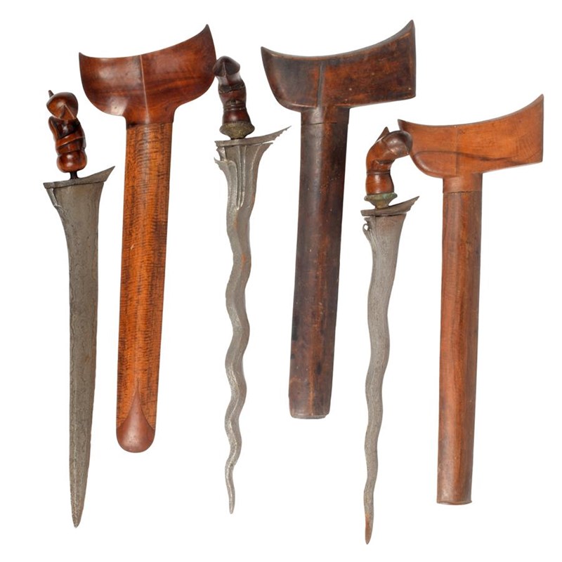 Three Malayan kris; one with a straight edge blade and with a wood hilt carved a stylized Garuda...