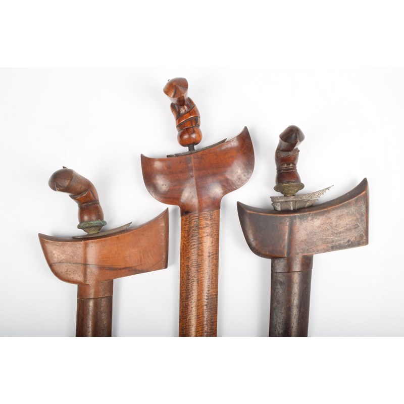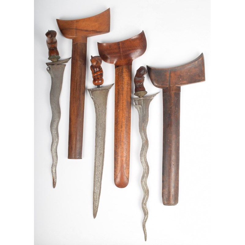 Three Malayan kris; one with a straight edge blade and with a wood hilt carved a stylized Garuda bird, in a hardwood sheath, 50cm long, the other two with wavy blades, carved wood stylized Garuda bird hilts and hardwood sheaths, 47cm and 48.5cm long. (6)