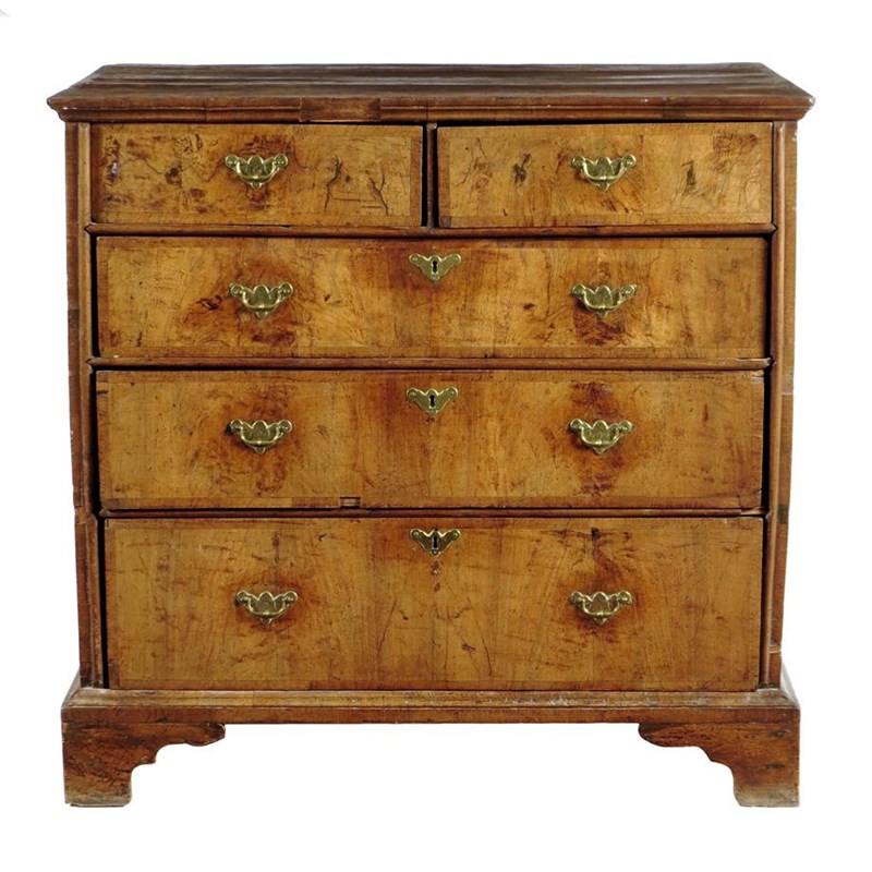 An early 18th century walnut and oak chest, of two short and three long crossbanded drawers, on bracket feet, 91.4cm high, 94.3cm wide, 56cm deep.