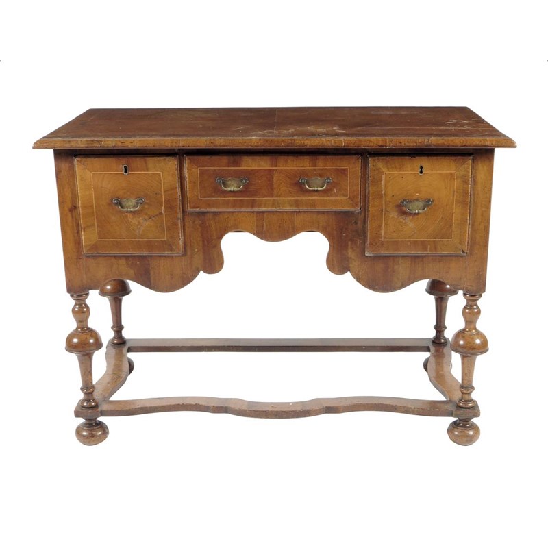 A walnut lowboy in Queen Anne style, the crossbanded and quarter veneered top above three drawers and a wavy edge apron, on inverted baluster supports united by a peripheral stretcher, on bun feet, 77cm high, 106.7cm high, 54.6cm deep.