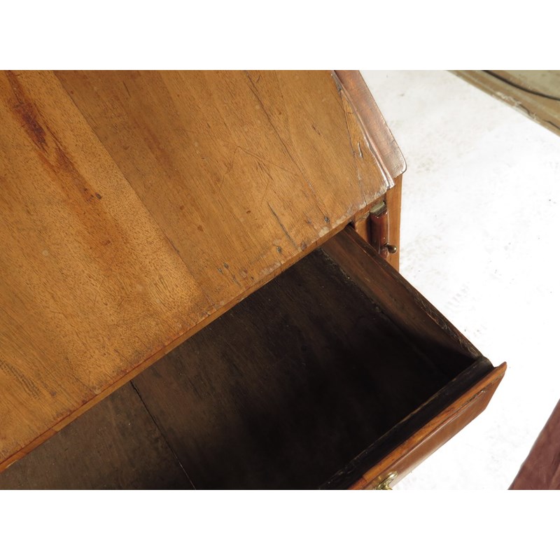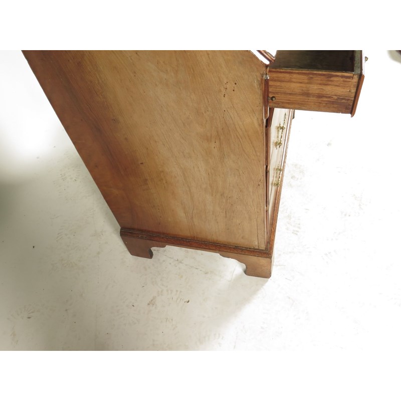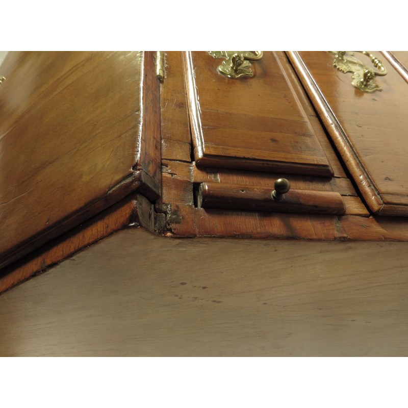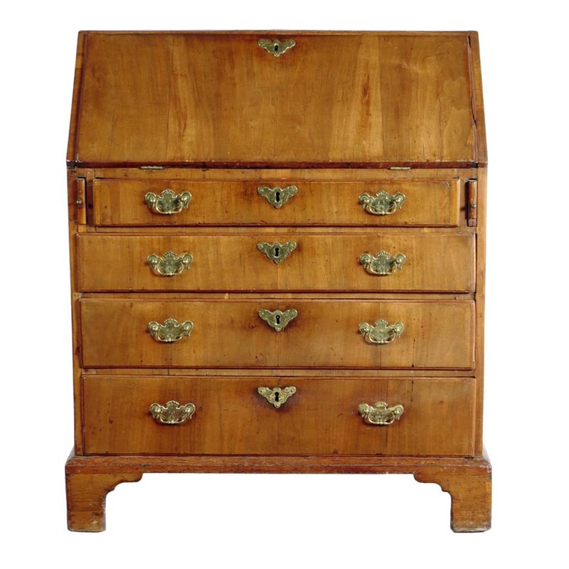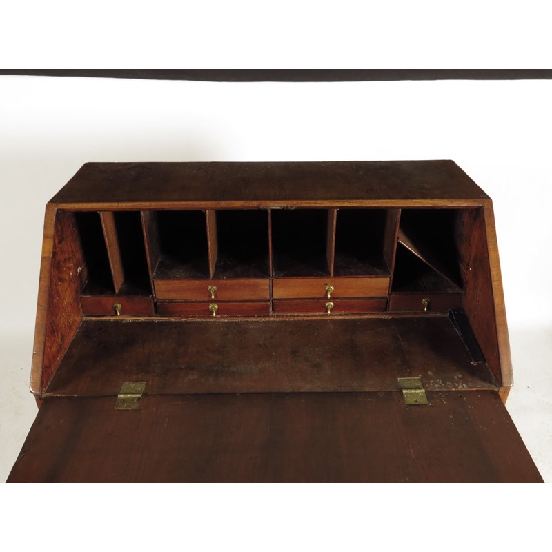 A George II walnut bureau, the interior fitted with pigeon holes and drawers above four long graduated drawers, 101.3cm high, 87.5cm wide, 49.8cm deep.