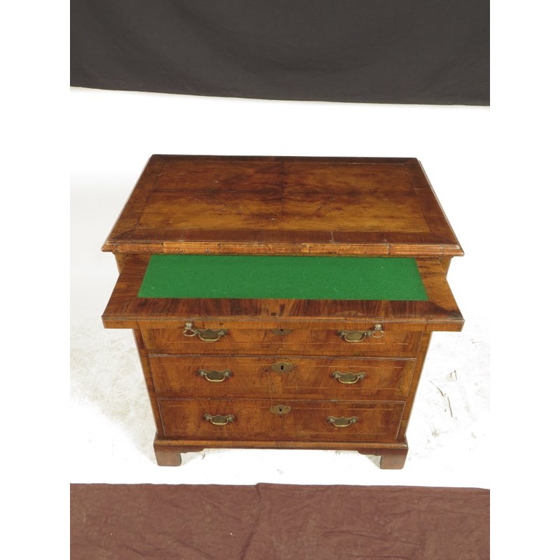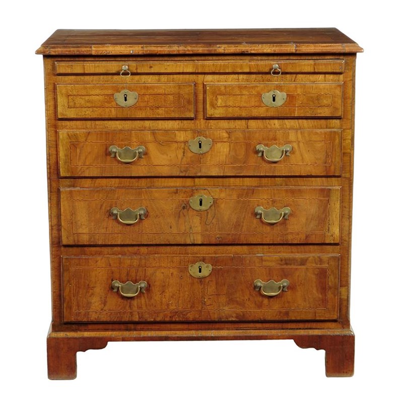 A George II walnut chest, inlaid with boxwood and ebonized stringing, the quarter veneered and crossbanded top with a moulded edge, above a brushing slide with a later baize lining, above two short and three long graduated drawers, on bracket feet, 79cm high, 73.5cm wide, 44cm deep.