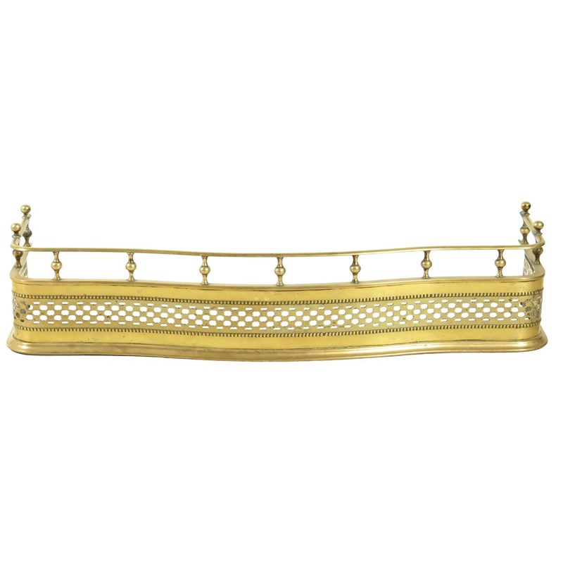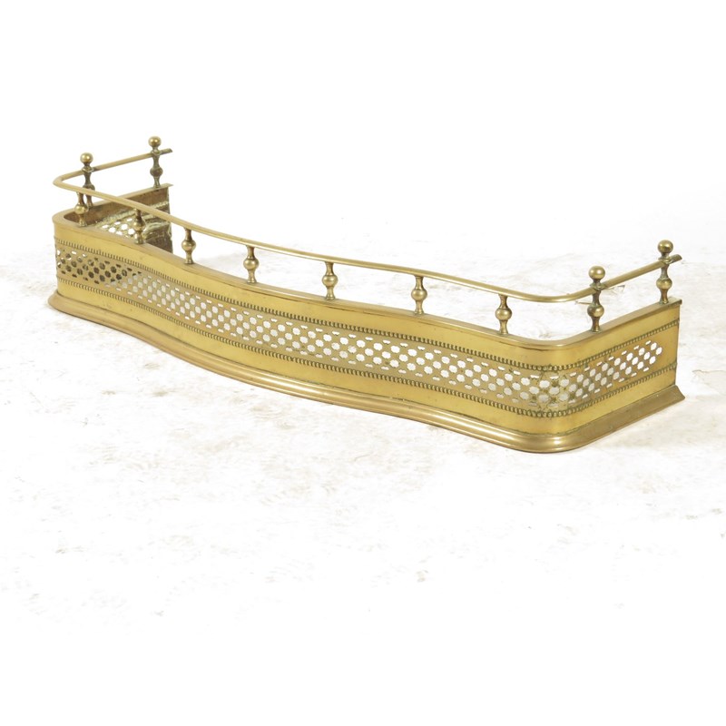 A Victorian brass serpentine fender, with a railed top and pierced base, 22.3cm high, 113cm wide, 35cm deep, together with a similar Regency brass fender with paw feet. (2)