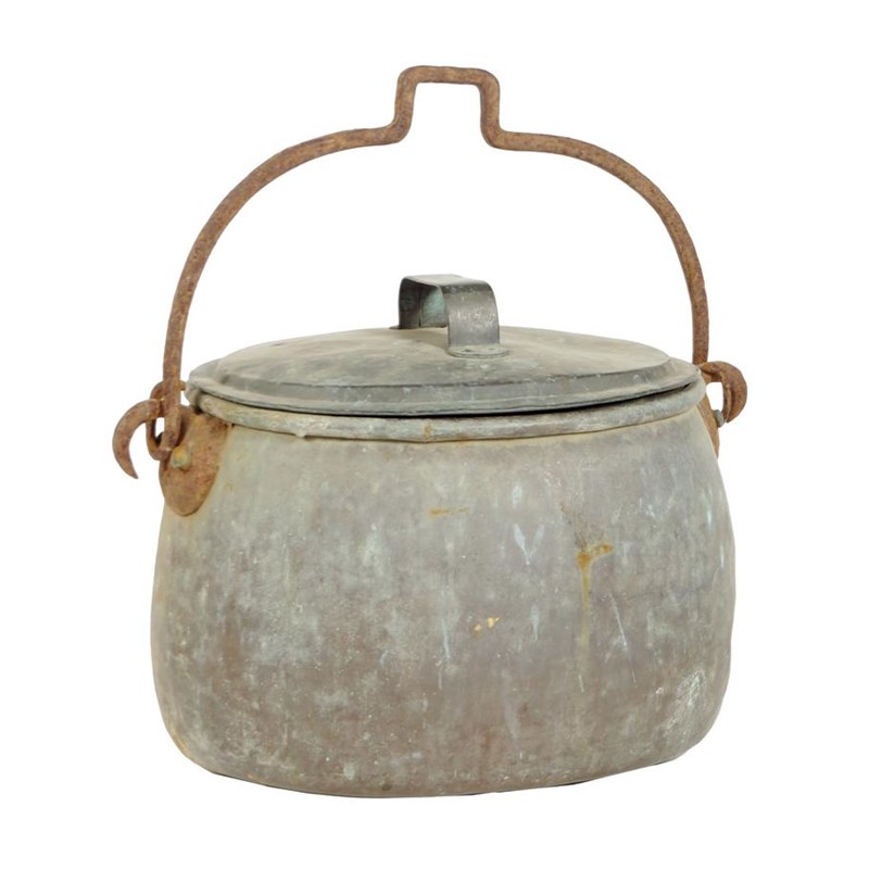 A large copper country house cooking pot and cover, with a swing handle, 31.4cm high, 34cm wide.