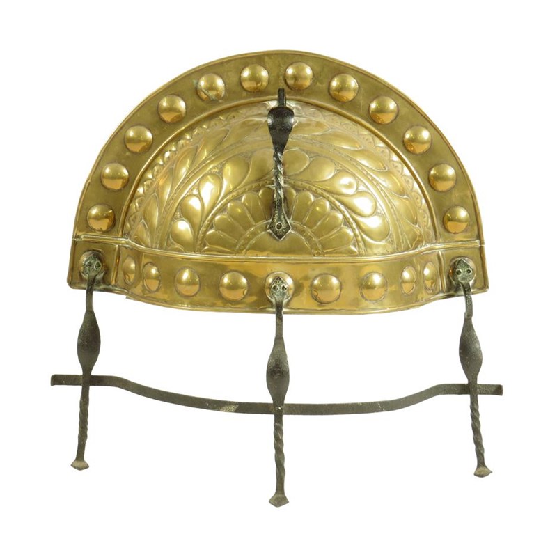 An 18th century brass and wrought iron curfew, with a lobed repousee decorated arched top on spiral twist legs and flattened pad feet, 51.8cm high, 56.6cm wide.