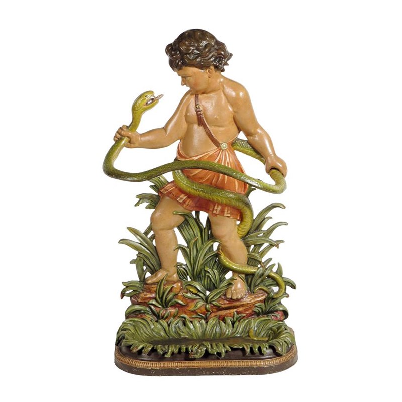 A Victorian and later painted cast iron umbrella stand, of the Infant Hercules wrestling with a snake, the design by Sheffield, Edwin & Theopilus Smith, with a lift-out drip-pan, 82cm high, 46.5cm wide, 26.5cm deep.