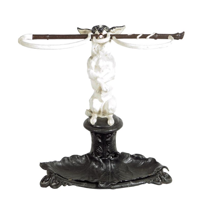 A Victorian novelty painted cast iron umbrella stand by Coalbrookdale, in the form of a chihuahua holding a riding whip in its mouth, the lift-out leaf shaped drip-pan stamped 'No. 85297' and with Victorian registration lozenge, 58.7cm high, 60.5cm wide, 36.3cm deep.