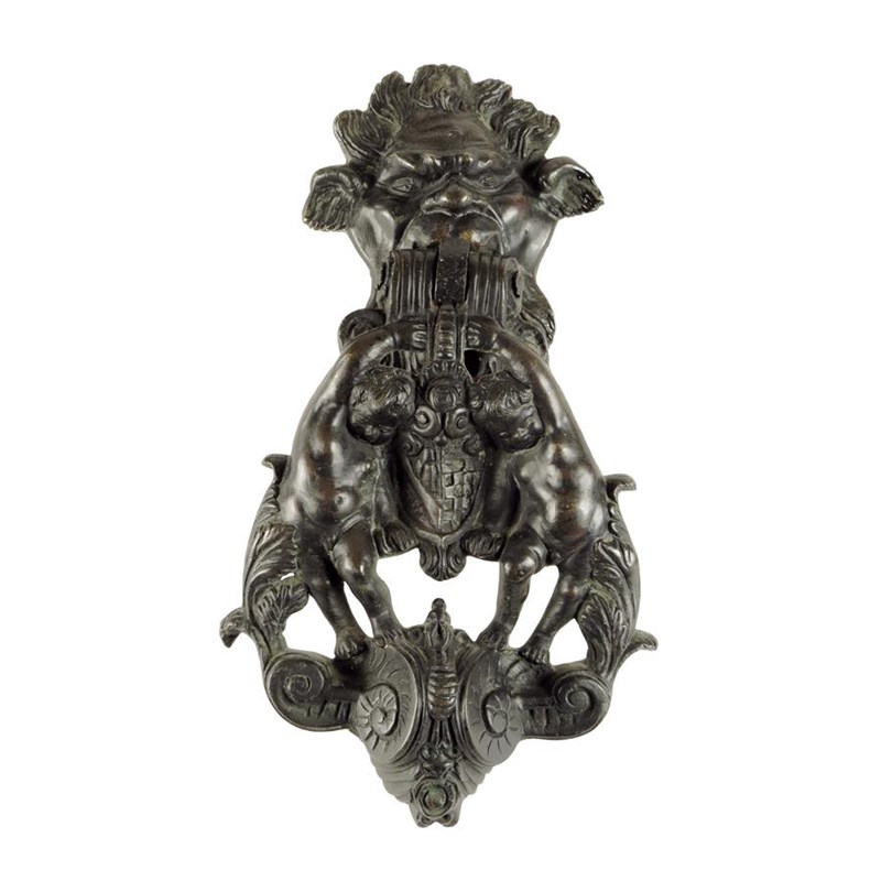 A 19th century Italian bronze door knocker, in the form of a pair of putti supporting a coat of arms, with a grotesque male mask plate, 31.5cm high.