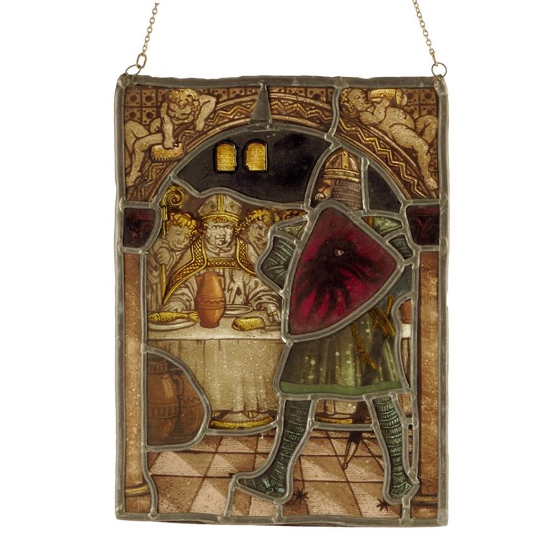 A German rectangular stained glass panel, depicting a Pope at a table with a loaf of bread and a fish with an attendant knight, late 19th / early 20th century, 27.3 x 20.3cm.