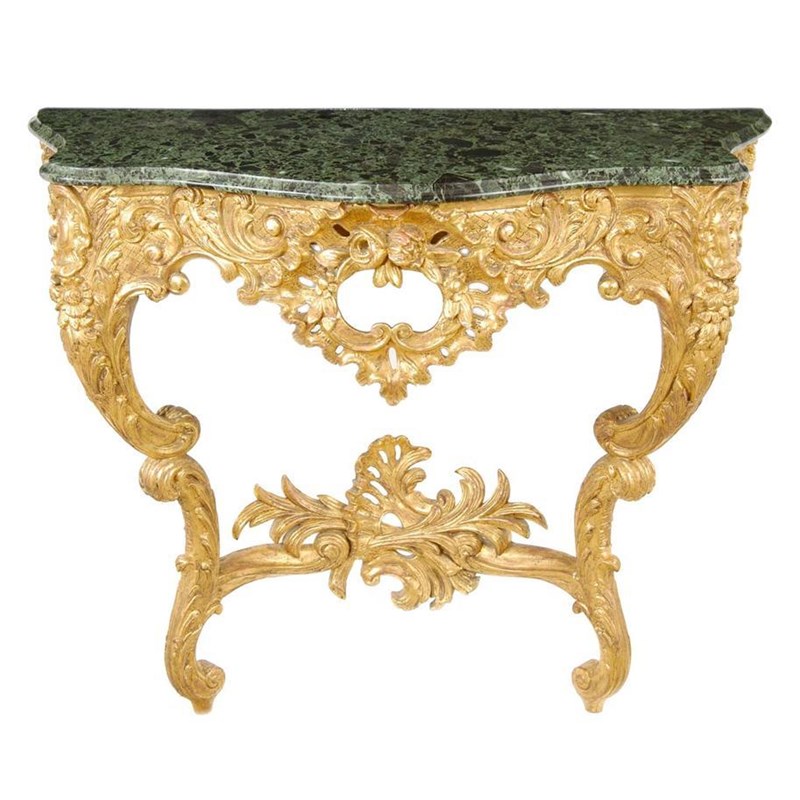 A carved giltwood console table, the verde antico marble top above a leaf and flower carved scrolling base, 19th century but re-gilt, 32.5in (82.6cm) h, 43in (109cm) w, 20.75in (52.5cm) d. Provenance: Tiverton Castle Sale, Bearnes, 1985.