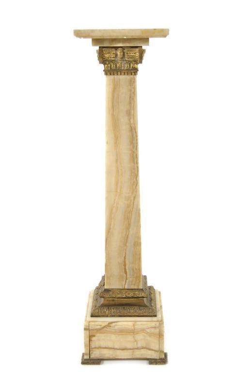 An onyx and gilt metal mounted column, the revolving detachable top to an Ionic capital and on laurel decorated feet, late 19th century, 45.5in (115cm) h, 12.5in (32cm) w.