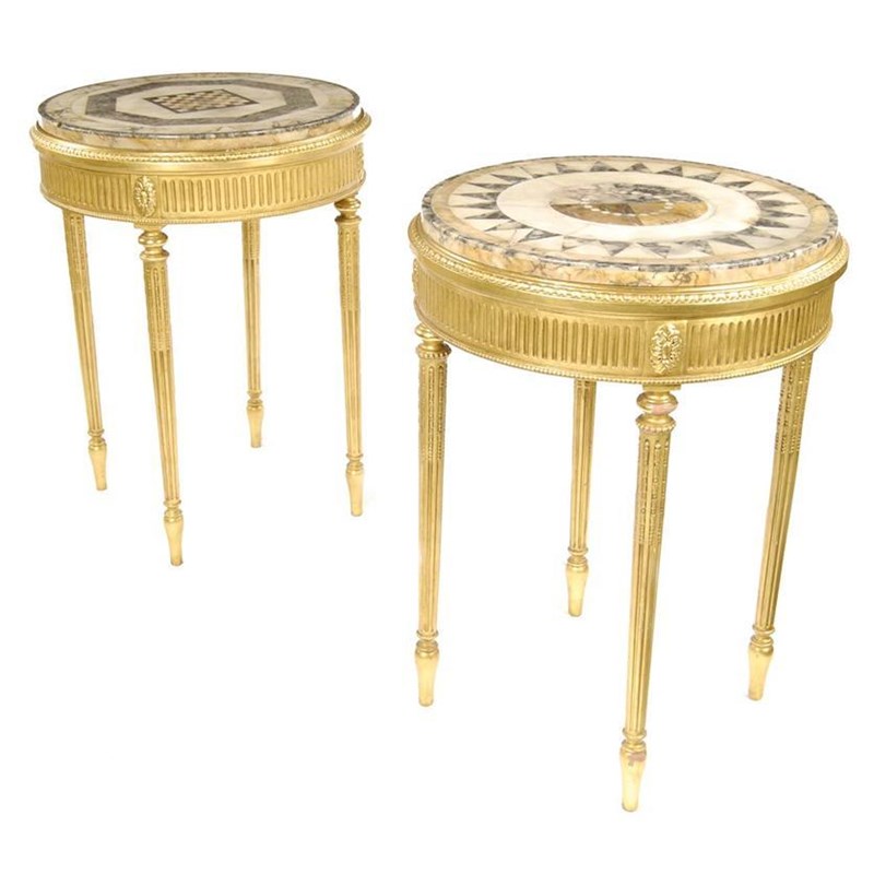 A pair of marble and giltwood lamp stands, one inlaid a chequer board the other with a sunburst design, to a fluted frieze and stop fluted turned tapering legs, 1st half 20th century, 34.25in (87cm) h, 26.25in (66.6cm) dia. (2)