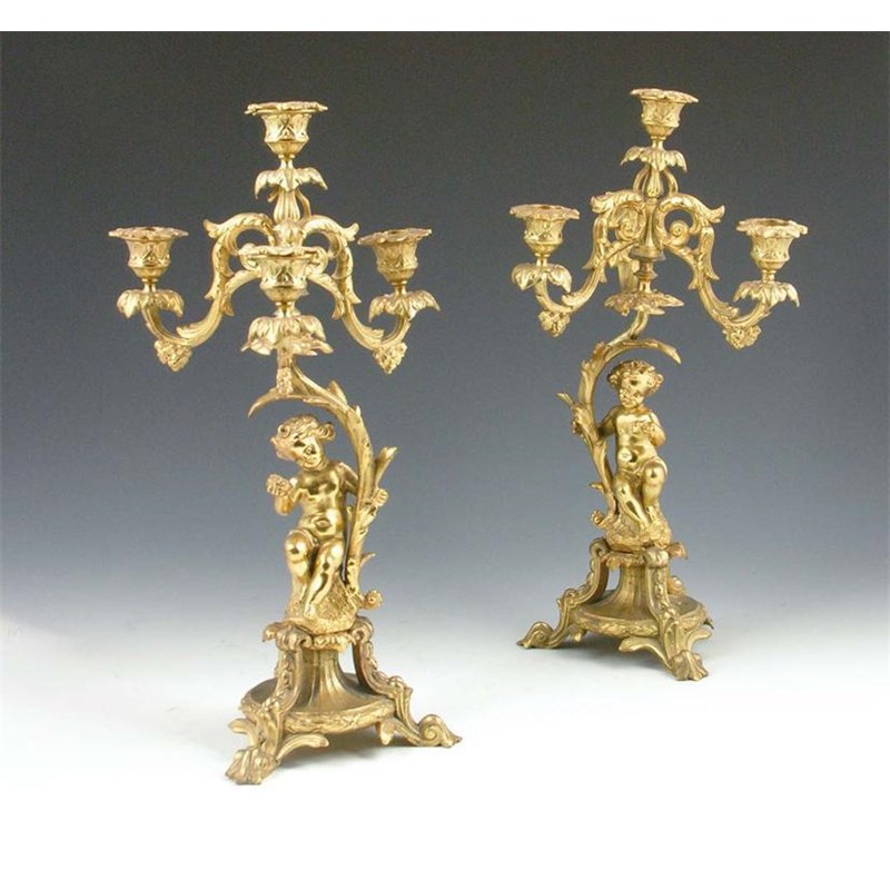 A pair of French gilt spelter four light candelabra, each with a putto supporting the leaf stem, 17in (43cm) h. (2) One foot repaired.