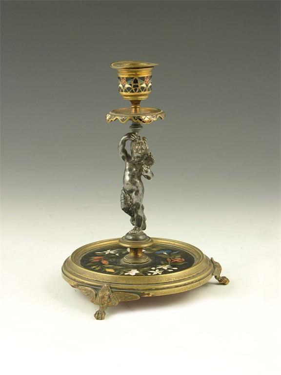 A late 19th century Italian pietra dura, champleve enamel and gilt brass candlestick, with a silvered coloured metal putto support holding a hand mirror, the silk underside with remains of gilt stamp for 'H Bosi', 7.5in (19cm) h.
